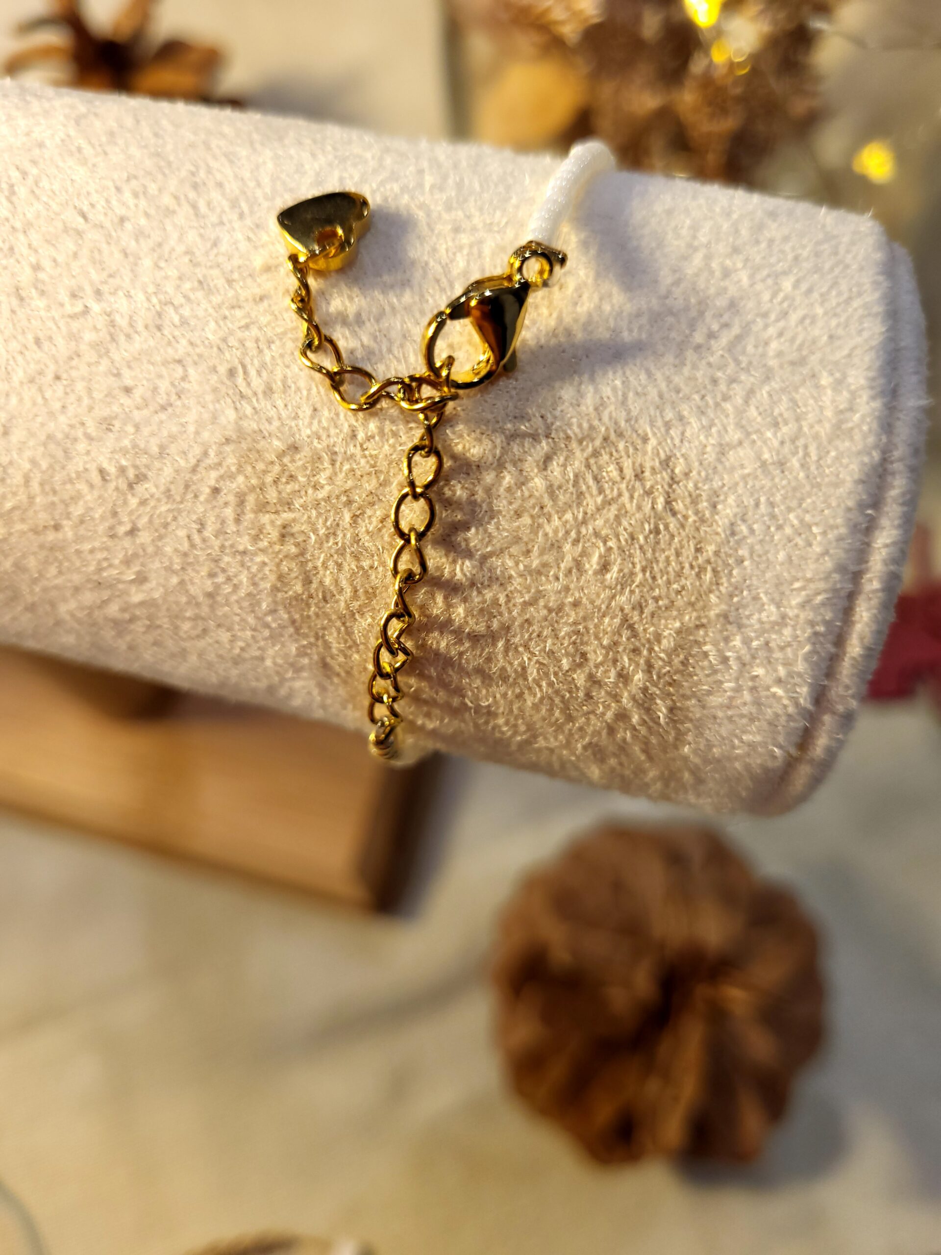 Bracelet fin en perle Miyuki, blanc nacré et doré, fermoir en acier et chainette de rallonge avec un coeur pour une finition girly.