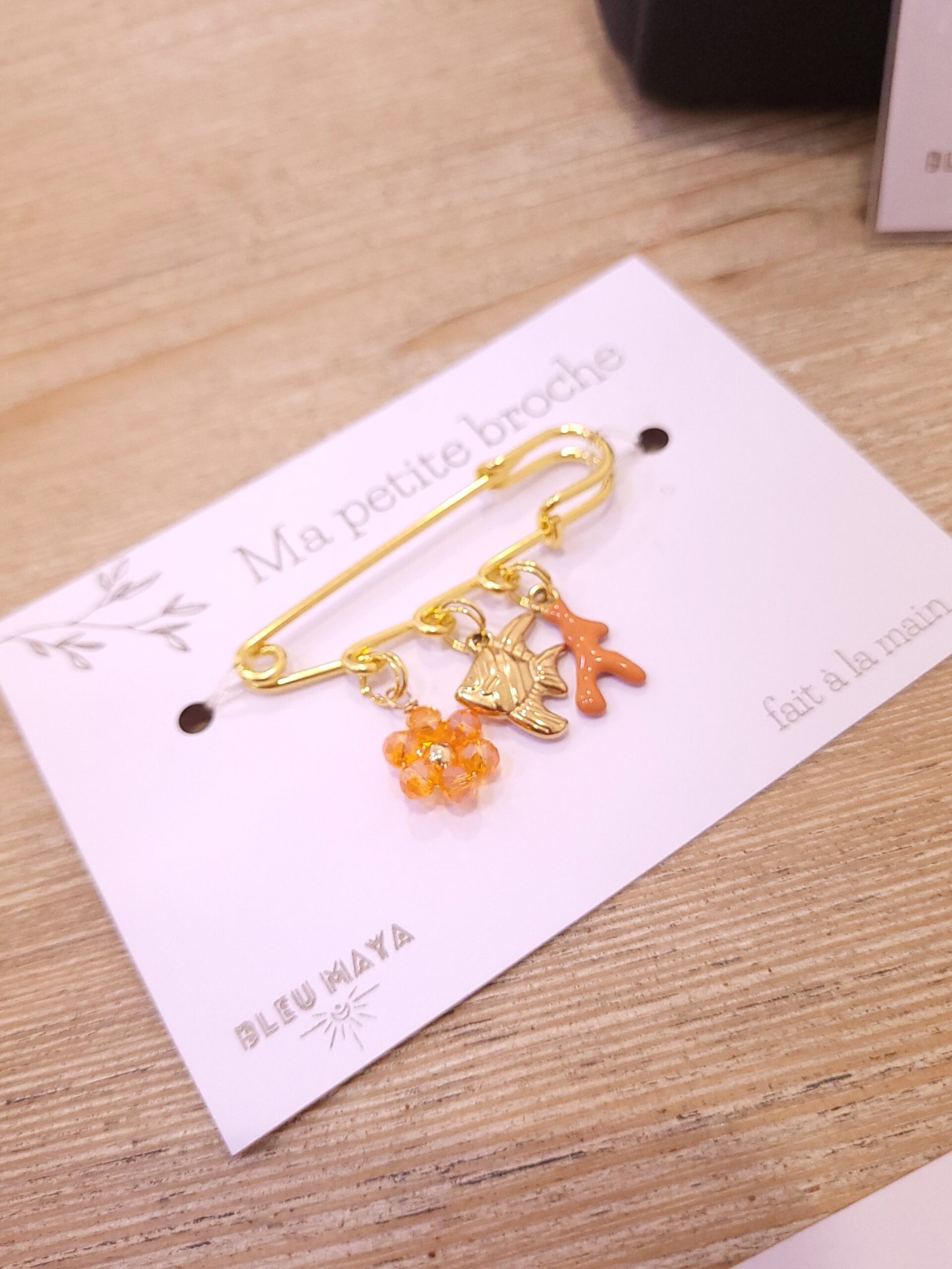 Broche en acier doré , 3 breloques, ton orangé Idéal pour fermer un décolleté échancré, customiser un sac ou même une veste en jean.