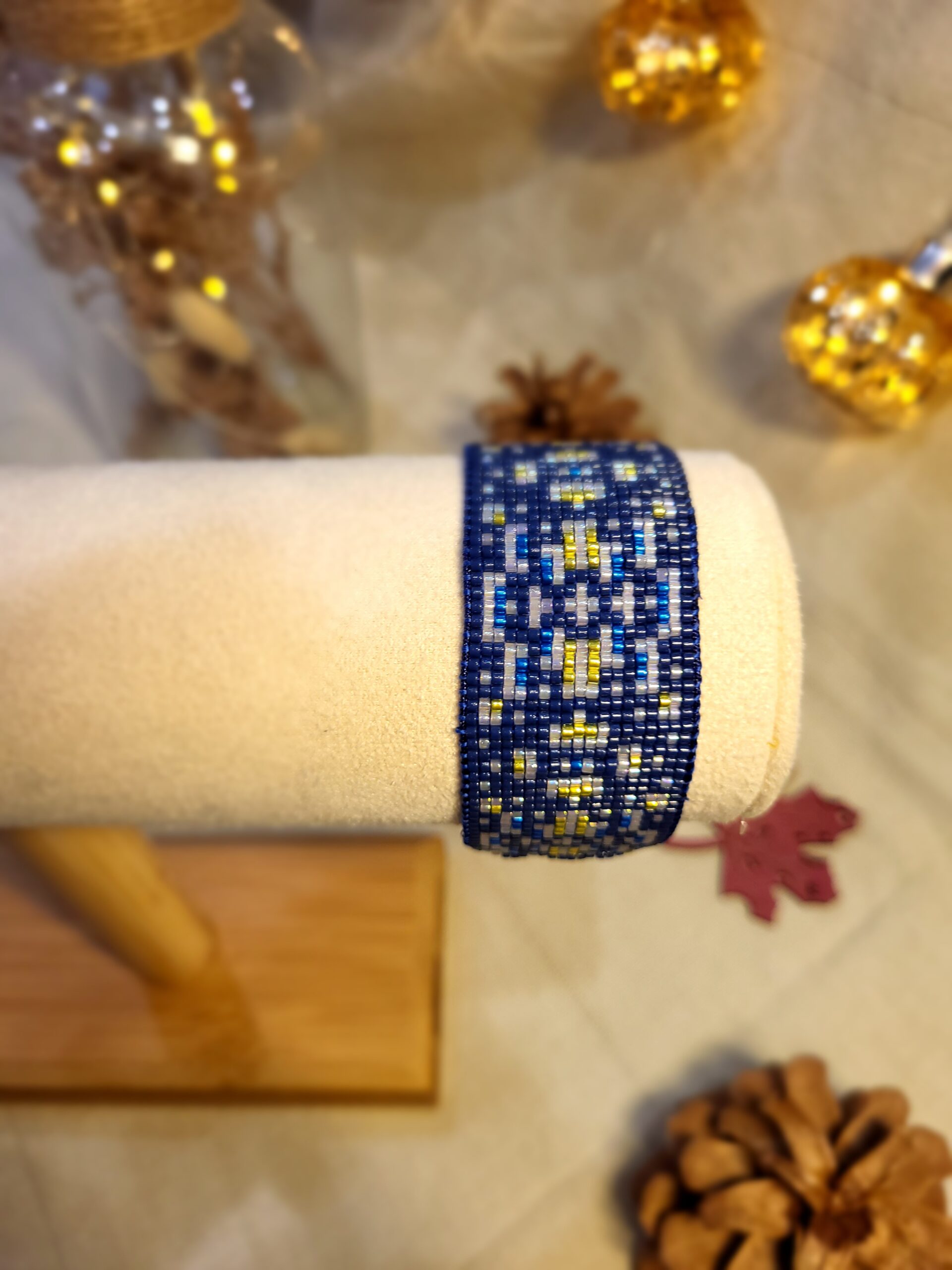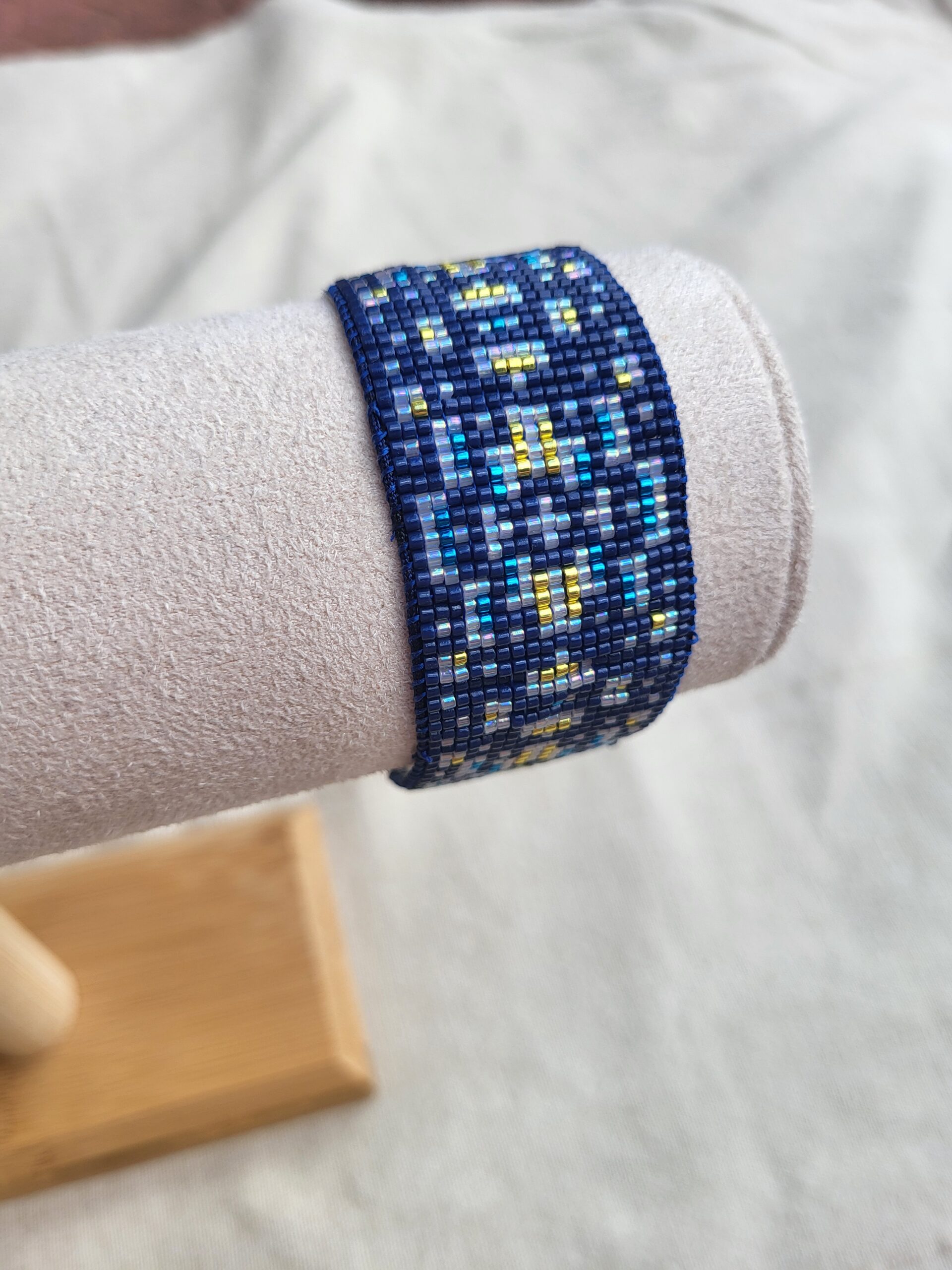 Bracelet manchette tissée à la main dans un camaïeu de bleu