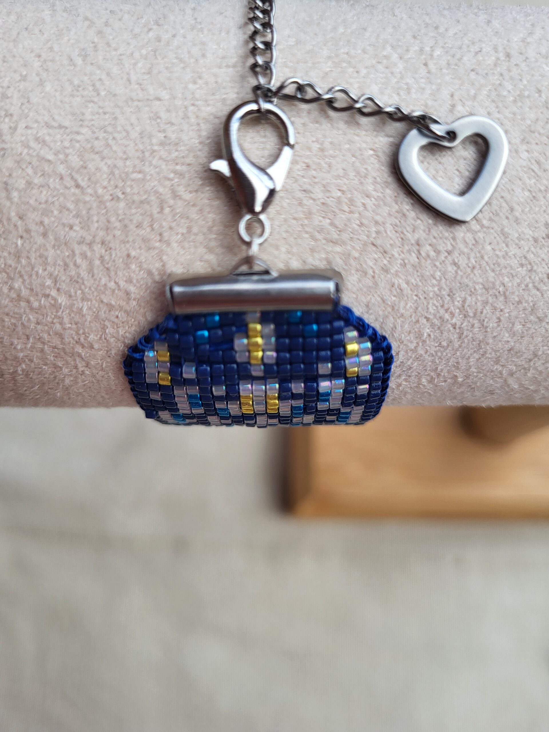 Bracelet manchette tissée à la main en perle Miyuki Delica dans un camaïeu de bleu. Fermoir en acier gris et sa chainette de rallonge avec finition coeur. Bracelet réglable de 15 à 20 cm pour une largeur de 3 cm